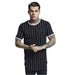 Slim-fit T-Shirt with O-neck. rounded lower hem. Has a vertically striped pattern of thin stripes. With contrasting colored trimming on the neck and sleeve hems.