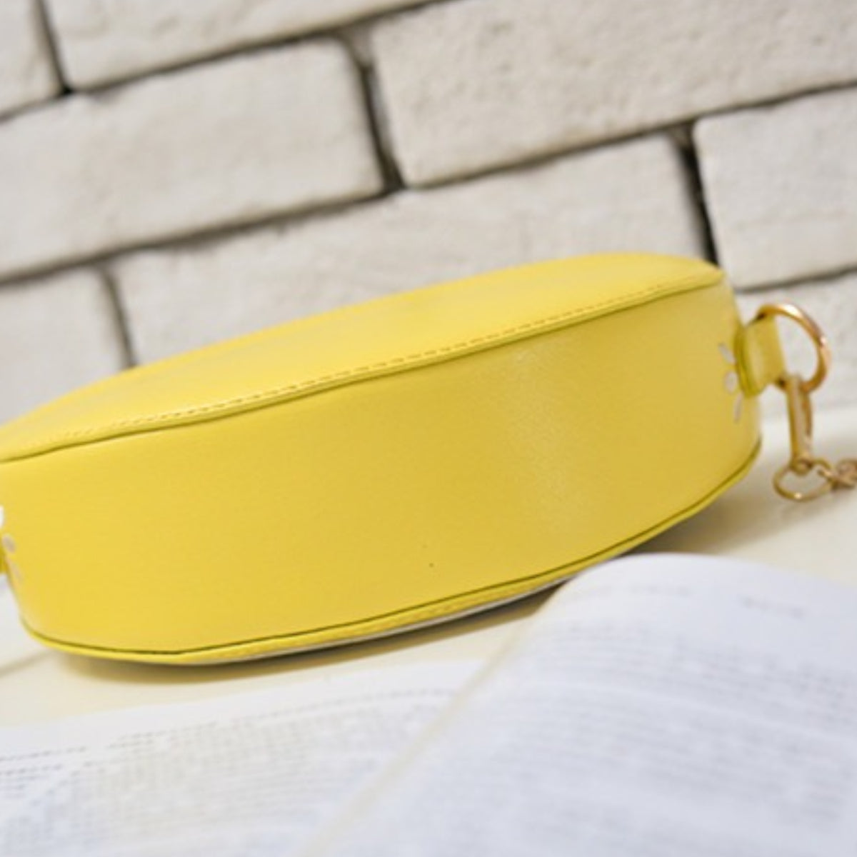 Detachable gold chain strap included.