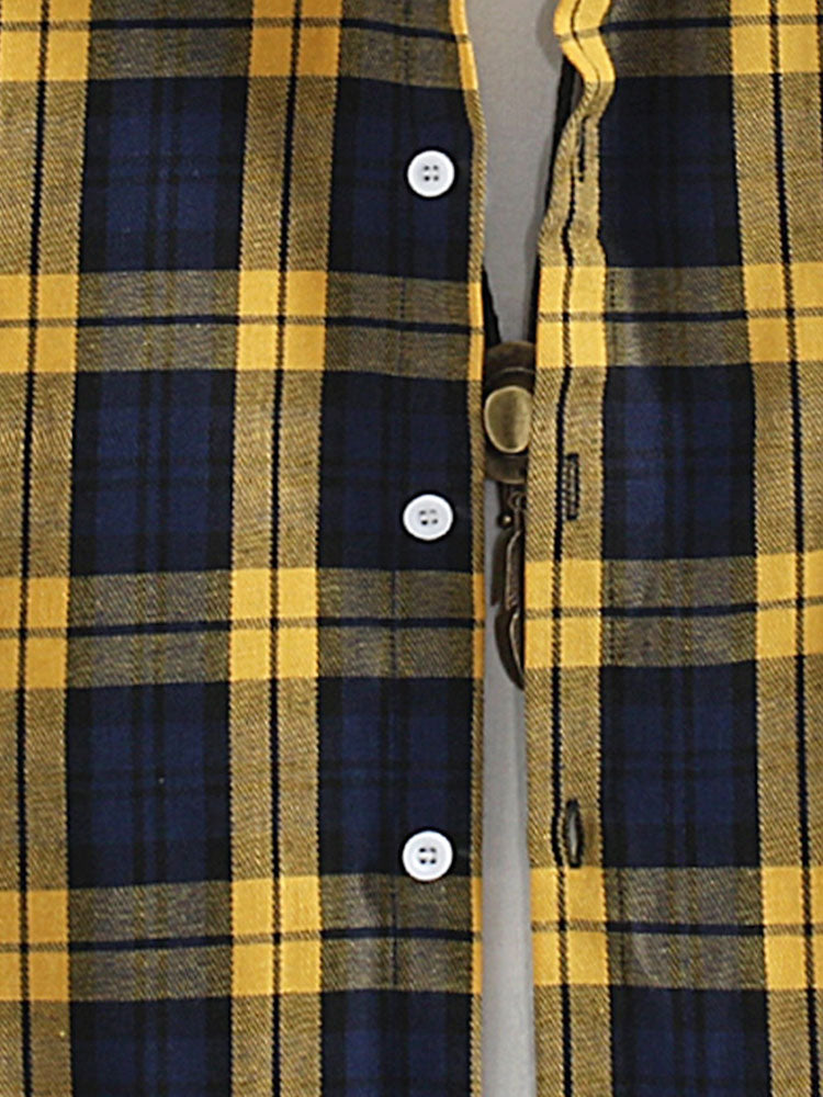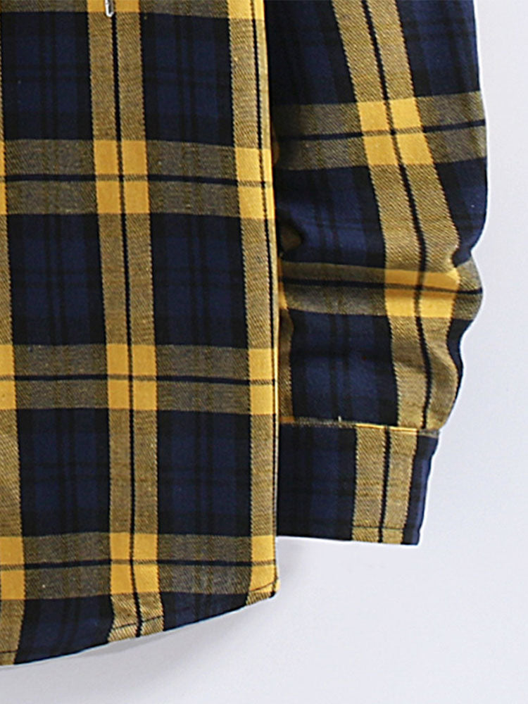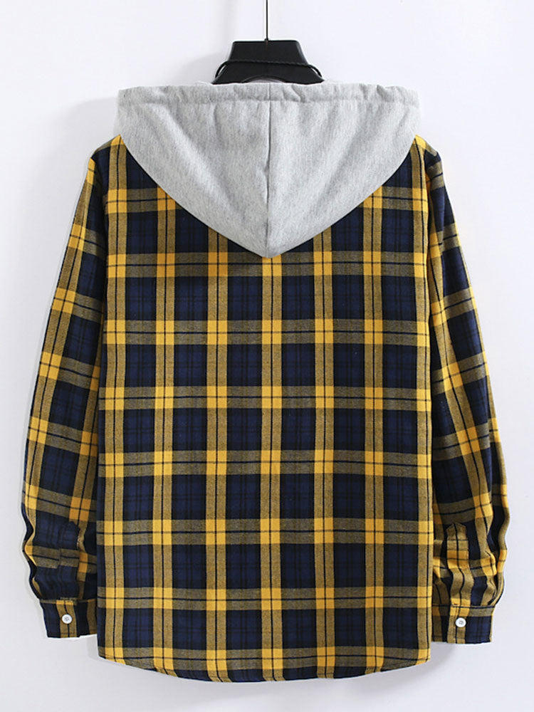 Yellow Plaid Contrast Shirt Casual Buttoned Hooded Long-sleeved Shirt